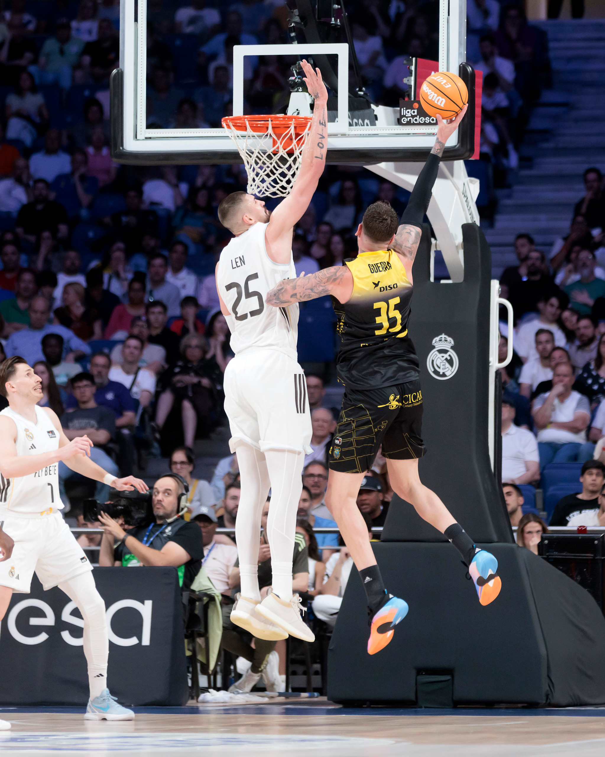 No se hizo de rogar la reacción de los locales, que aprovecharon las visitas de Andrés Feliz al tiro libre y la envergadura de Len y Tavares para intentar estrechar el cerco: 32-35, tras un parcial de 7-0. Lejos de verse intimidado, La Laguna Tenerife aguantó el tirón, exprimió su fluidez ofensiva y firmó varias acciones de mérito, incluido un 2+1 de Rokas Giedraitis y un triplazo de Patty Mills para irse a la pausa cuatro arriba (41-45).